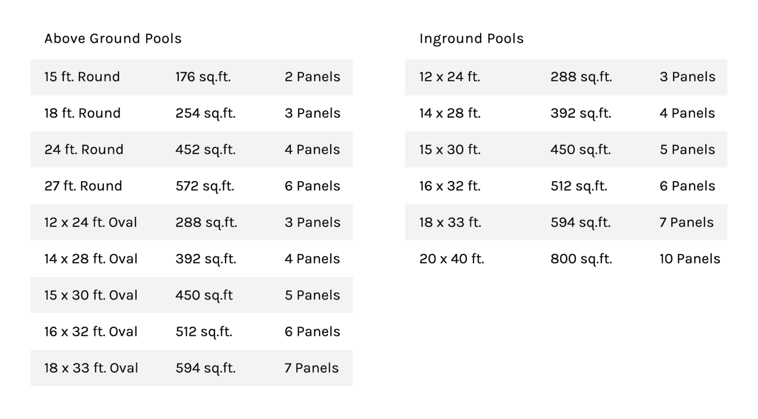 Refer to the chart below to help determine how many panels are required for your pool. Other factors are also considered in determining optimal panel requirements such as pool depth, wind shelter (or lack thereof), and panel location with reference to the noon-day sun. We install the panels allowing room for future expansion if necessary.